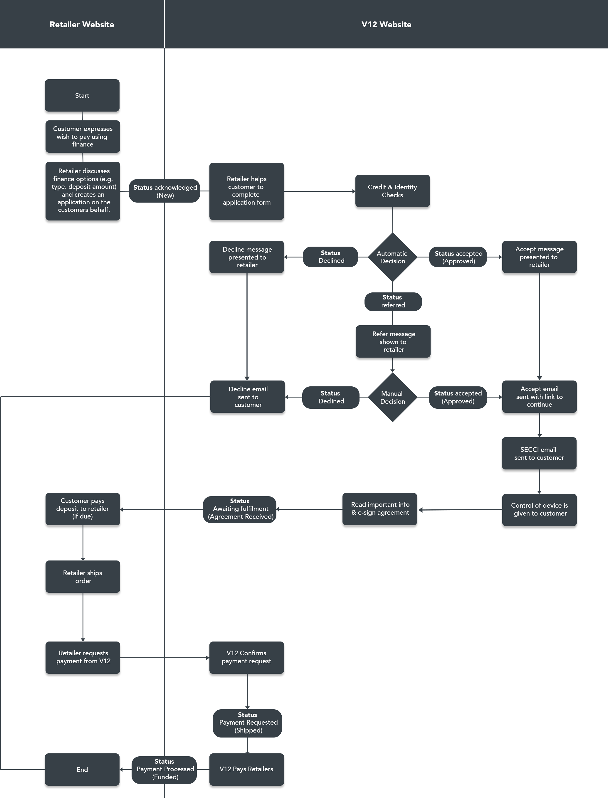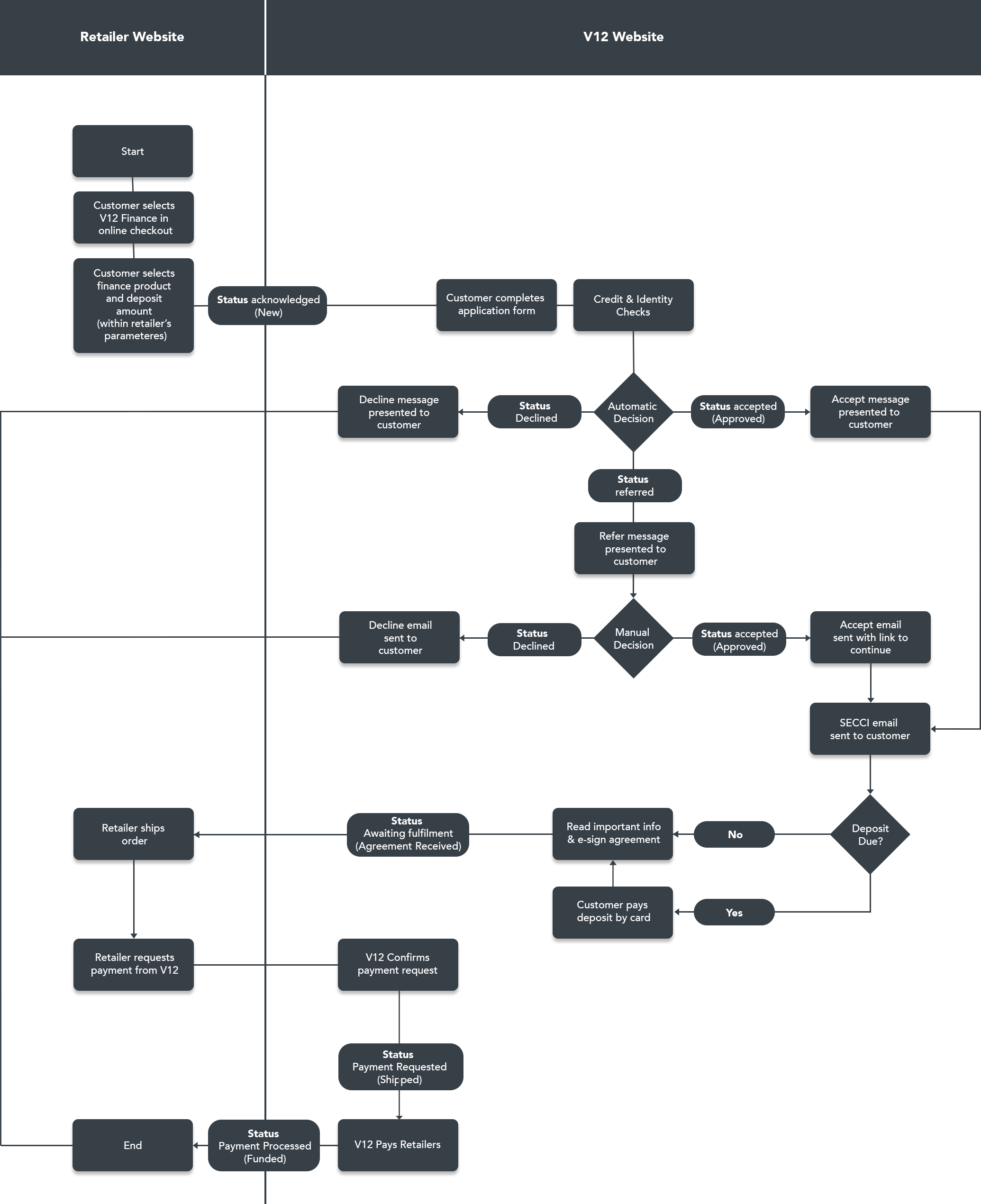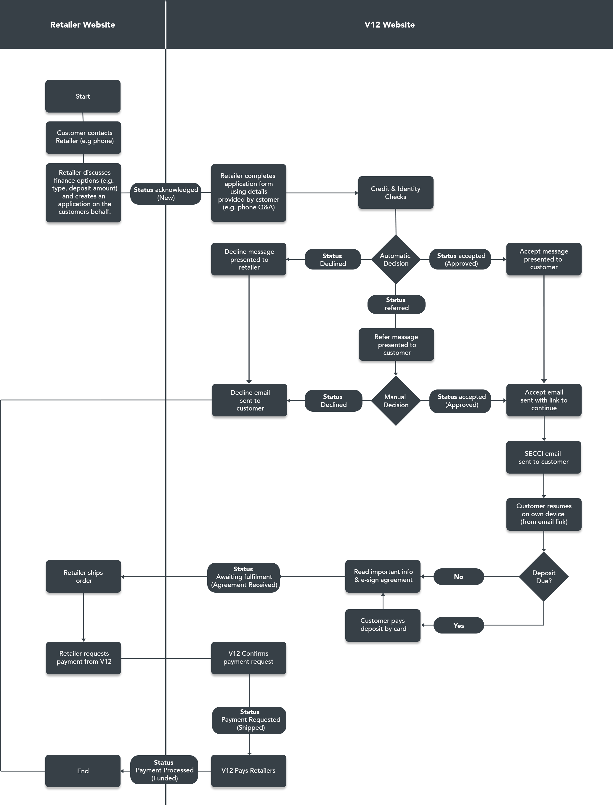Welcome to the V12 Retail Finance Integration Guide. This site is designed to provide you with comprehensive details on how to integrate your website to the V12 Retail Finance Application Gateway.